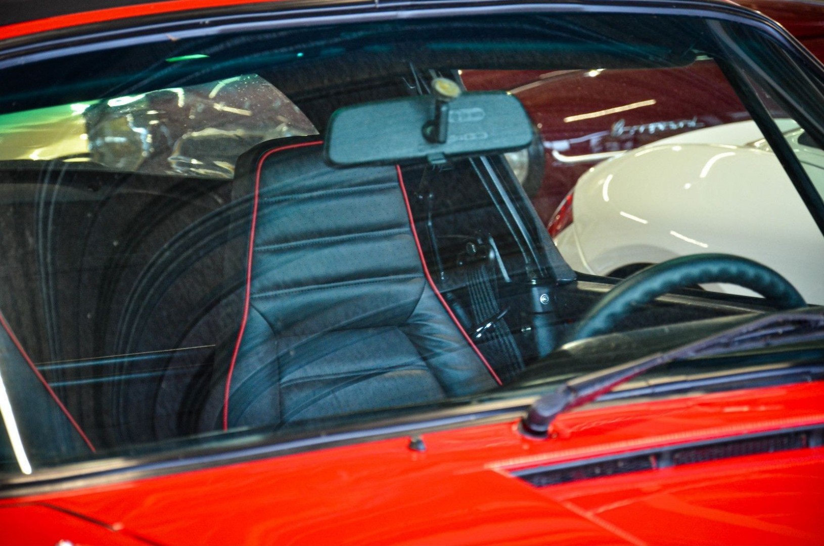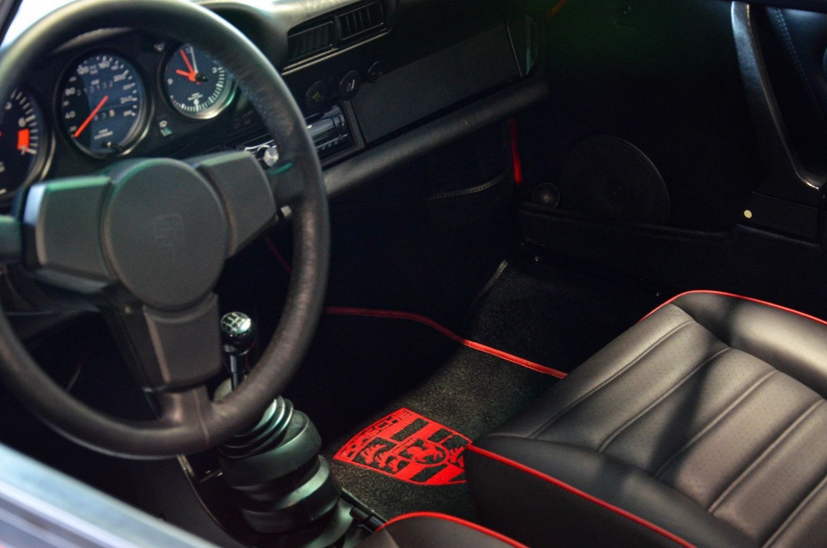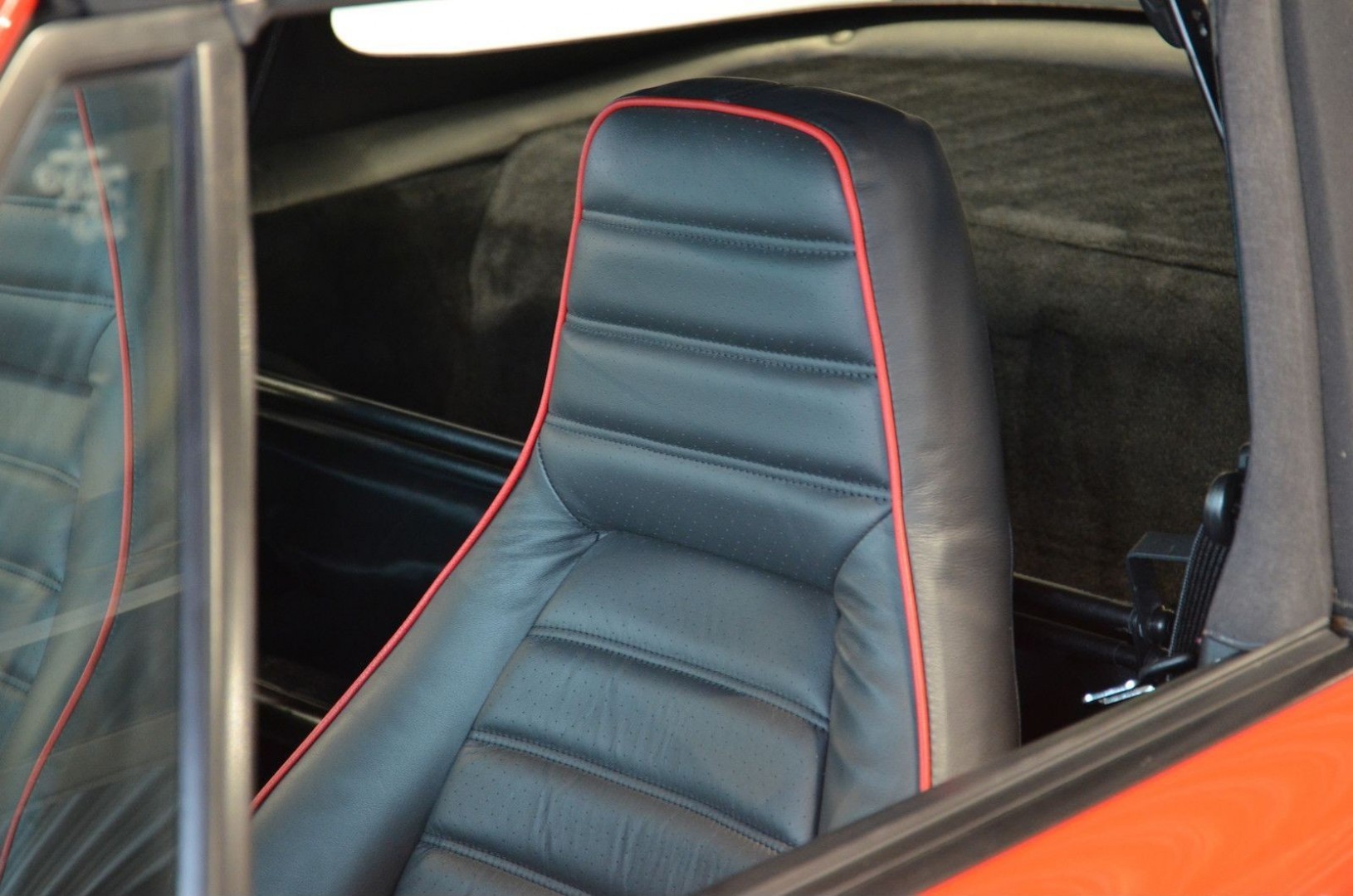 - Интерьер: Передние сиденья перетянуты натуральной кожей с красной контрастной прострочкой и перфорацией на центральных вставках. Весь пол покрыт новым ковровым комплектом, точно повторяющим форму салона.