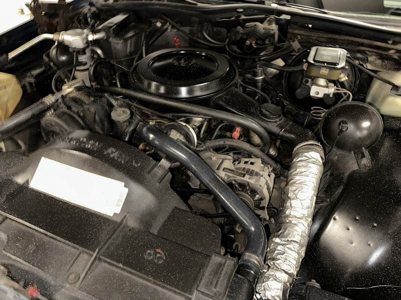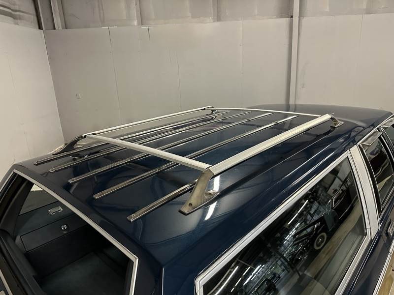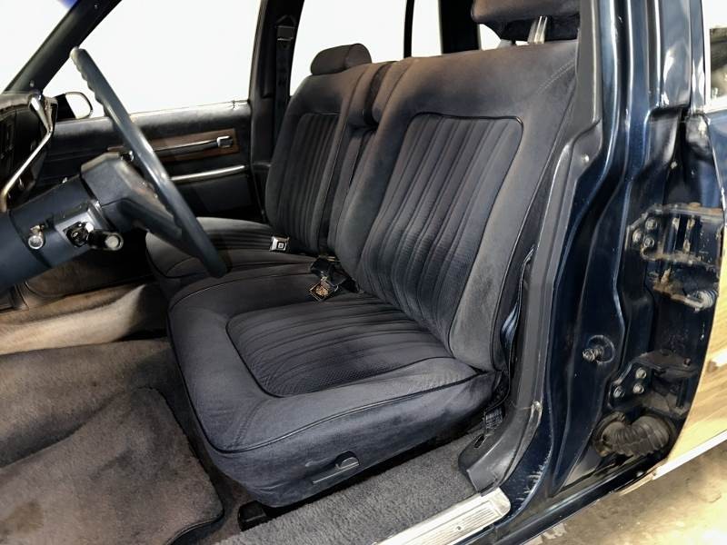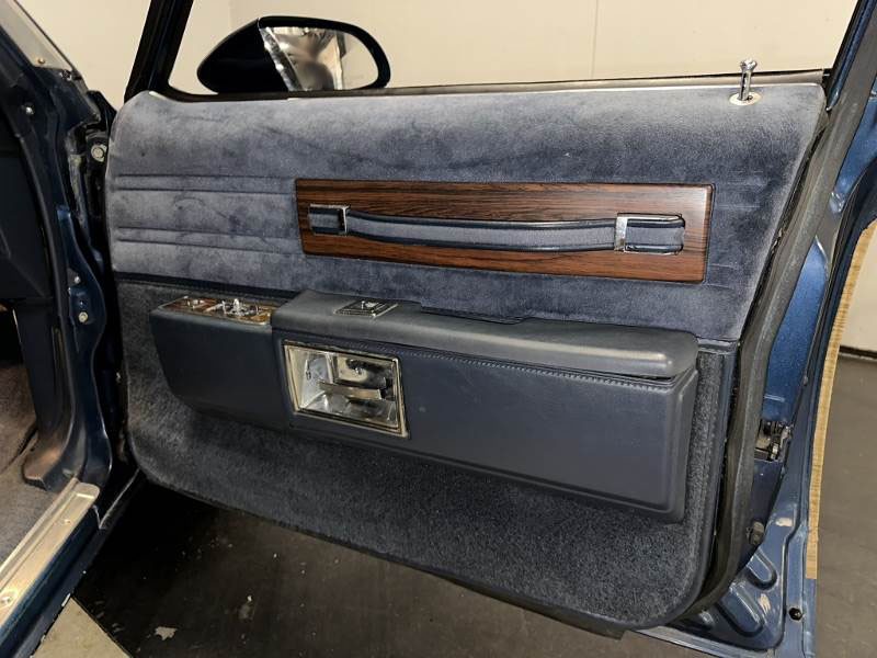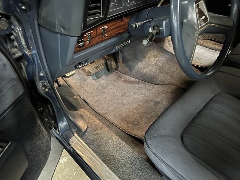 - Интерьер: Салон отделан синим велюром — передние и задние сиденья, дверные панели и коврики. Приборная панель с деревянными вставками, хотя и имеет трещины, сохраняет аутентичный вид. Установлено заводское радио AM/FM/Cassette, кондиционер и обогрев работают исправно.