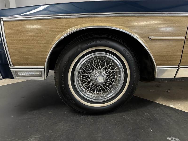 - Экстерьер: Синяя окраска кузова дополняется декоративными деревянными вставками по бортам — хотя на них есть небольшие повреждения, общий вид остаётся эффектным. Хромированные бамперы, решётка радиатора, зеркала и колпаки на проволочных дисках с белостенными шинами подчёркивают винтажный шарм.