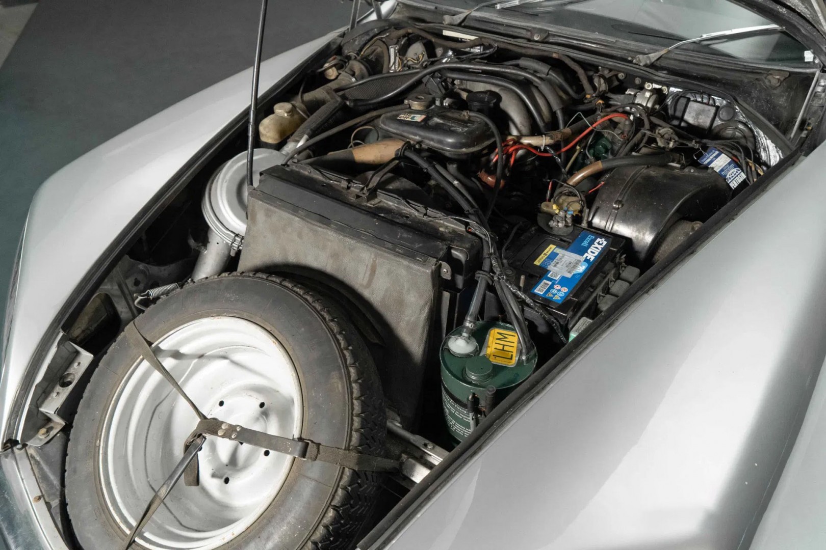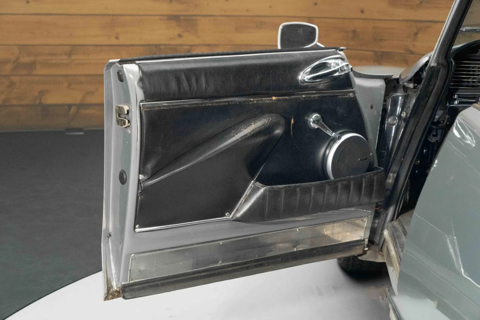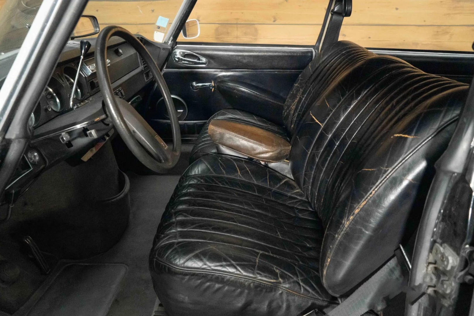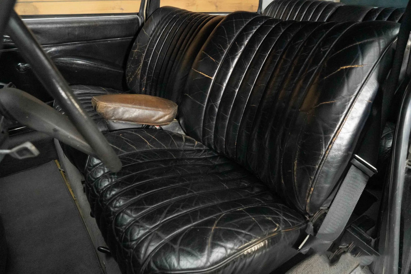 - Интерьер отделан чёрной кожей с естественной патиной, что подчёркивает подлинность и историю автомобиля.