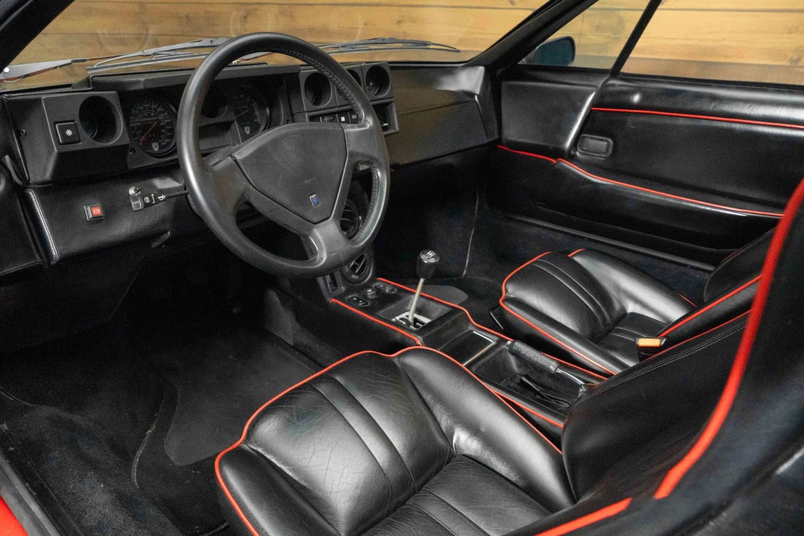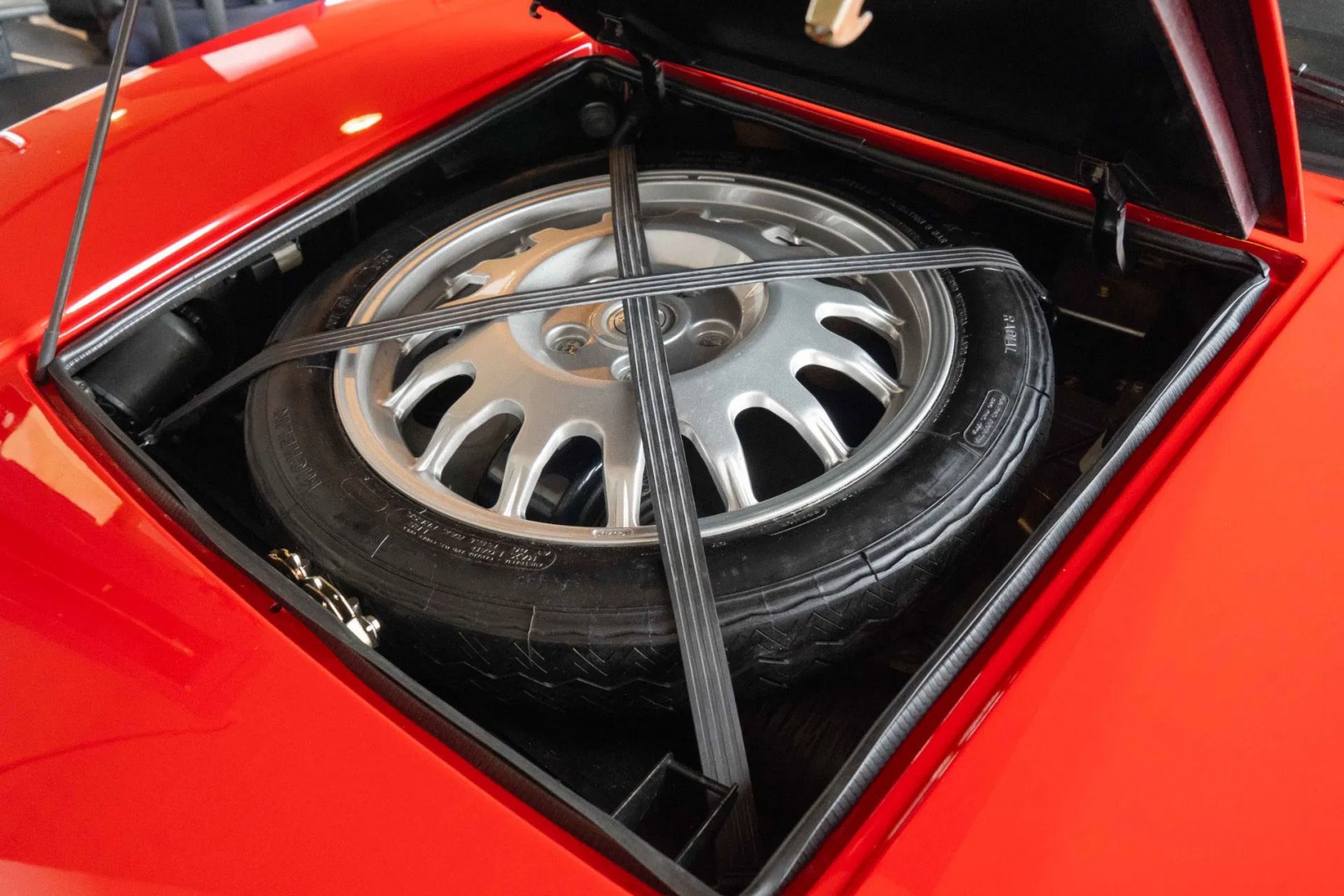 - Экстерьер: Глубокий красный лак сохраняет заводской блеск, без следов перекраски. Агрессивные линии кузова, характерные для Bertone, подчёркнуты фирменными Countach-дисками — редкостью даже среди Jalpa.